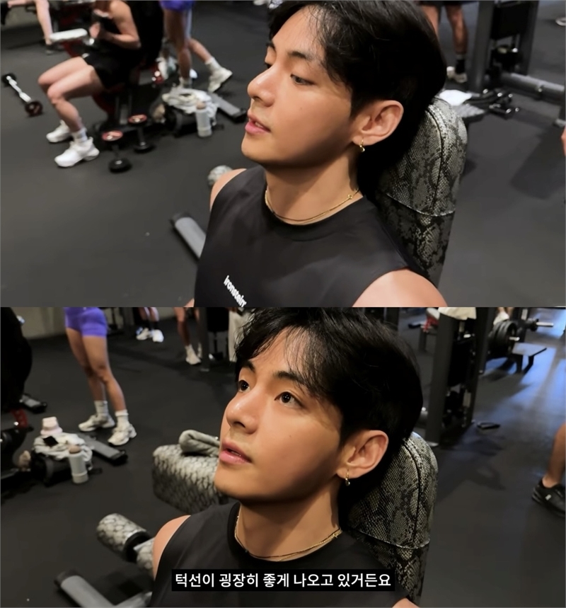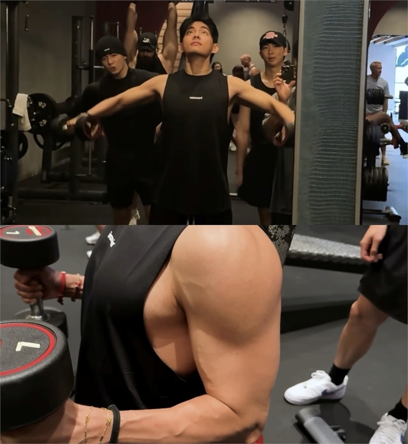 검은색 민소매 티셔츠를 입은 뷔는 무거운 덤벨을 올리는 팔운동을 하면서도 날렵한 턱선을 자랑했다. 특히 힘든 운동임에도 인상을 쓰지 않고 편안하게 유지하며 잘생쁨의 정석을 뽐내 감탄을 자아냈다. 이어 마선호가 알려준 대로 로우 머신 자세를 교정하면서 운동에 열중했다. 뷔는 힘든 운동에도 웃음을 잃지 않고 멤버들에게 장난을 치면서 즐거운 분위기를 연출했다.