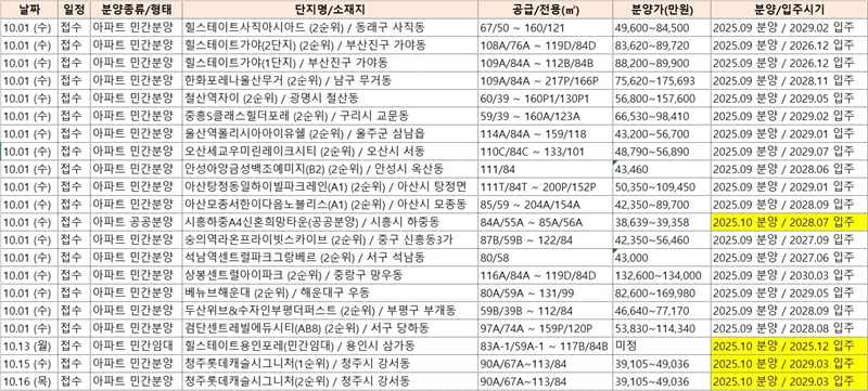 10월 접수를 받는 분양 물량 (자료=부동산R114, 정리=손기호)