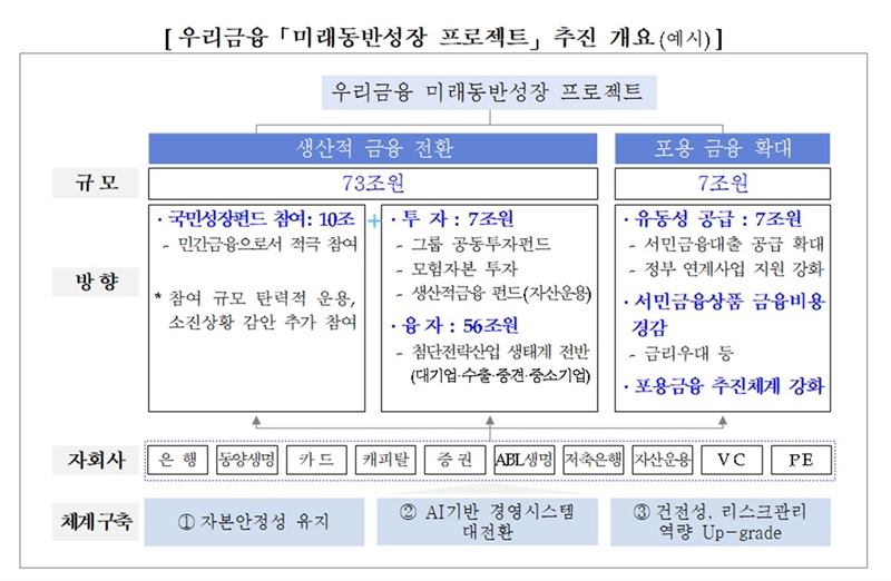 이날 직접 브리핑에 나선 임종룡 회장은 "미래동반성장 프로젝트는 기업금융 명가로서 축적해 온 노하우와 강점, 종합금융그룹 완성을 통해 진용을 갖춘 자회사들의 역량을 총동원해 창업-성장-도약 등 기업 성장단계별 지원을 위한 핵심 전략"이라며 "본 프로젝트 완수를 통해 생산적 금융으로의 전환과 포용금융 확대를 이뤄 우리금융 지속성장의 기반도 다지겠다"고 강조했다.