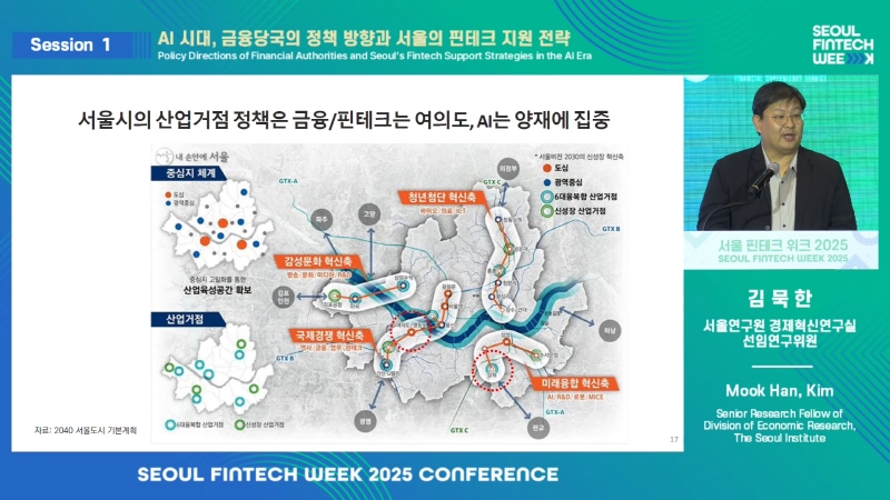 이어 발표를 맡은 김묵한 서울연구원 경제경영연구실 선임연구위원은 AI·핀테크 산업을 육성하기 위해 서울시 차원에서 이뤄지는 지원 현황을 공개했다. 그는 "핀테크 육성지원 조례를 제정해 지원 근거를 수립하고, 스타트업, 창업을 중심으로 성장을 촉진하고 있다"고 말했다.