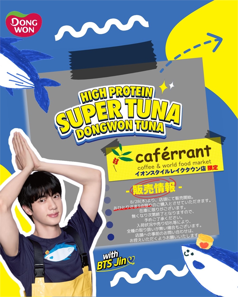 방탄소년단 진의 사진을 넣은 참치캔으로 구성한 이 제품은 지난 7월 27일 ‘네이버 쇼핑라이브’에서 사전 판매를 진행할 당시 40초만에 1000개가 판매되는 등 뜨거운 관심을 받았다.