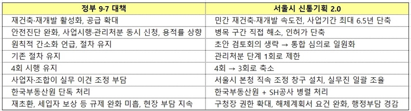 정부 9·7 주택공급 대책과 서울시의 신속통합기획 2.0 비교 (정리=손기호)