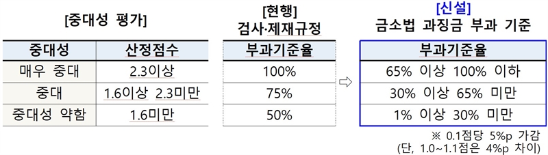 다만, 경우에 따라서는 ‘거래금액’ 기준을 일률적으로 적용하는 것이 불합리할 수도 있어 별도의 방식으로 산정하는 기준을 감독규정에 반영했다. 현행 검사·제재규정상 기본과징금 산출에 활용되는 ‘부과기준율’은 3단계(50%-75%-100%)인데, 바뀐 규정에서는 1~30%(중대성 약함), 30~65%(중대), 65%~100%(매우 중대)로 규제의 경직성이 완화됐다.