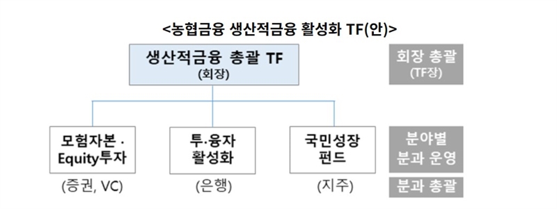 NH농협금융지주(회장 이찬우)는 생산적금융 활성화에 신속하게 대응하기 위해 금융지주 회장이 주관하는 전사 차원의 '생산적금융 활성화 태스크포스(TF)'를 신설한다고 1일 밝혔다.