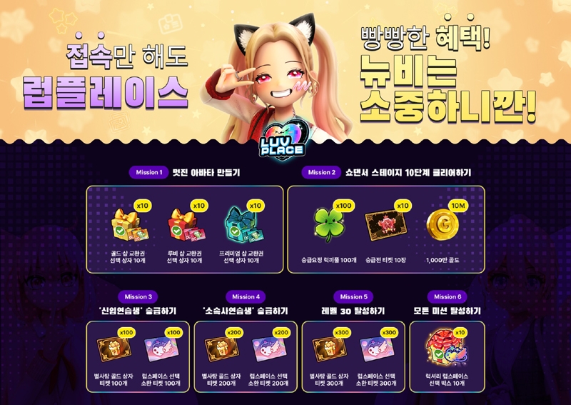 먼저 아바타 만들기를 시작으로 스테이지 10단계 클리어, 신입 연습생 완성, 소속사 연습생 완성, 레벨 30 달성, 모든 미션 달성까지 총 6단계의 미션 목표가 주어다. 미션을 수행할 때마다 골드와 루비, 프리미엄 샵 교환권 선택 상자, 승급 요정 ‘럭끼풀’ 100개, 승급전 티켓, 별사탕 골드 상자 티켓 등 다양한 아이템을 얻을 수 있고, 모든 미션 완료 유저는 특별 보상으로 ‘럭셔리 럽스페이스 선택 박스 10개’가 지급된다.