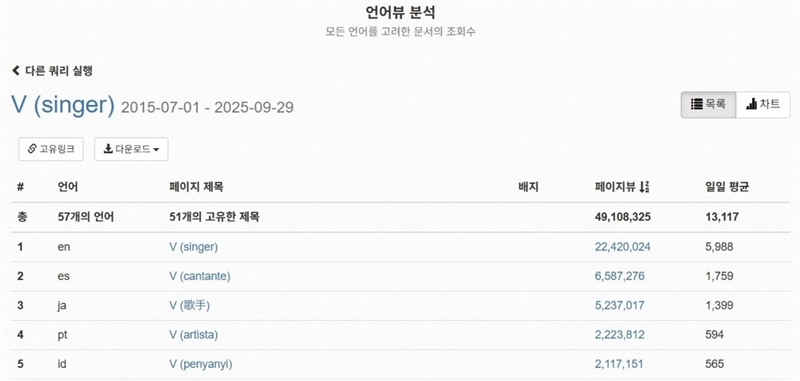 구글트렌드와 더불어 주요 인기 지표 중 하나인 위키피디아에서도 뷔의 위상을 확인할 수 있다. 뷔는 현재까지 4911만 뷰수를 기록하며, K팝 아티스트 1위를 유지 중이다. 2024년도에는 위키피디아에서 ‘2024년 전 세계인들이 가장 많이 찾아본 남자 팝스타’ 7위를 차지한 바 있다.