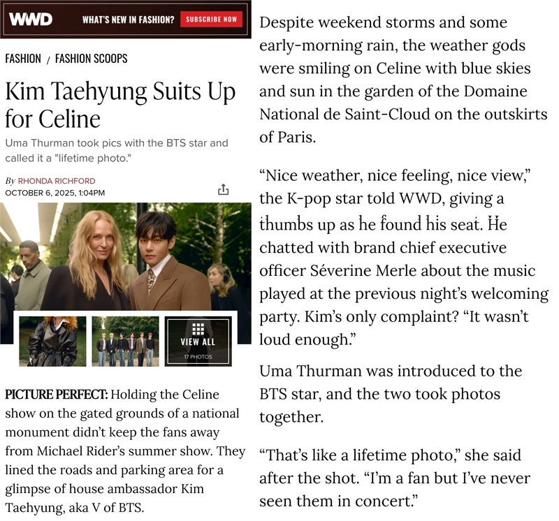 뷔는 사진을 찍기 전에 매무새를 다듬는 우마 서먼을 도와 머리를 정리해주는 다정한 면모를 보였다. 우마 서먼은 활짝 웃으면서 감사의 인사말을 전했다. 우마 서먼은 WWD에게 뷔와 함께 찍은 사진에 대해 “그건 인생 사진과 같다”라고 촬영 소감을 남겼다. 이어 “팬이지만 콘서트는 가 본적이 없다”며 아쉬움을 드러냈다.