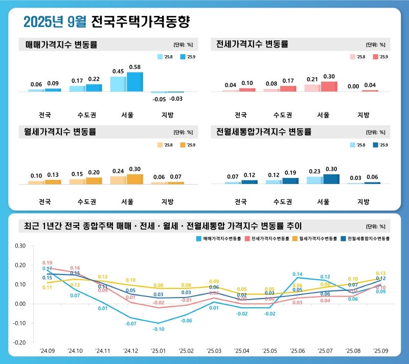 한국부동산원이 13일 발표한 '2025년 9월 전국주택가격동향조사'에 따르면, 9월 한 달 동안 전국 주택 매매가격은 0.09% 상승하며 전월(0.07%)보다 상승 폭을 키웠다. 수도권(0.22%)과 서울(0.58%)은 상승세를 이어간 반면, 지방(-0.03%)은 하락했다.
