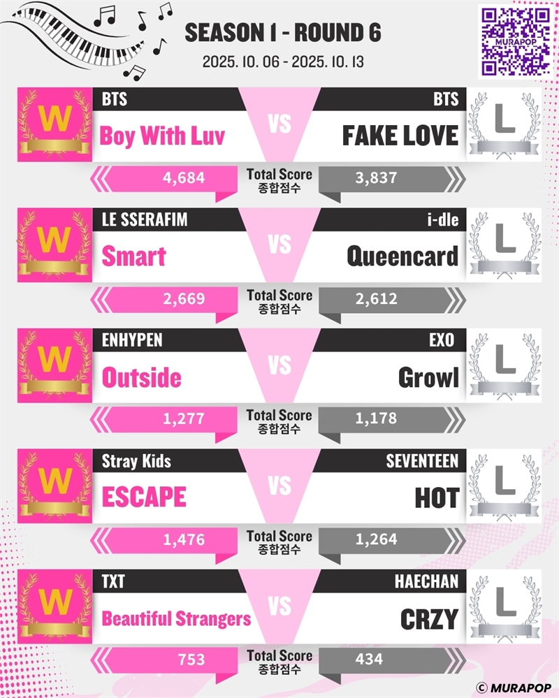 최근 글로벌 K-POP 매치 플랫폼 뮤라팝(MURAPOP)은 10월 6일부터 13일까지 시즌 1-6회차 뮤직비디오 라이벌매치를 진행했다. 이번 회차는 5개 매치 모두 조회수가 박빙이었고, 팬 투표가 최종 승부를 갈랐다.