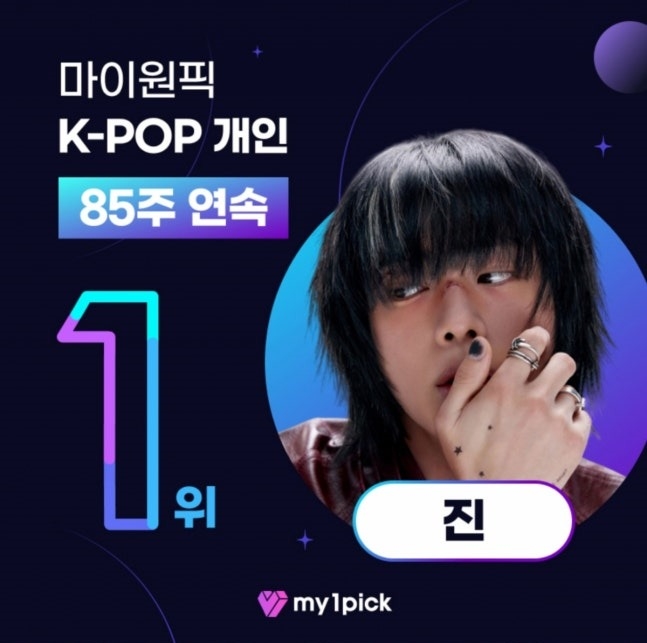 방탄소년단(BTS) 진이 글로벌 투표 플랫폼 마이원픽(MY1PICK)에서 85주 연속 정상을 지켰다.
