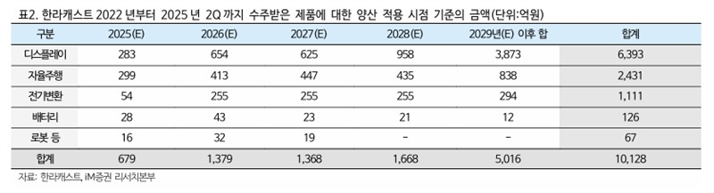 한라캐스트의 올해 상반기 기준 신규수주는 3523억원에 이른다. 지난해 신규 수주 (3947억원) 규모와 비슷한 수준이다. 또한 올해 상반기 기준 수주잔고는 1조128억원에 이르고 있는데, 전장용 디스플레이(6393억원)와 자율주행 부품(2432억원) 등이 대부분을 차지한다. 해를 거듭할수록 향후 매출 성장성이 가속화되고 있다.