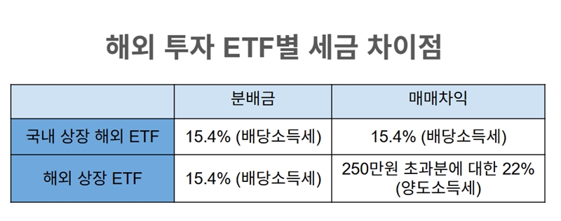 단, 해외 상장된 ETF든 국내 상장된 해외 ETF든 분배금에 대해서는 모두 15.4%의 배당소득세가 부과된다는 점은 동일합니다.