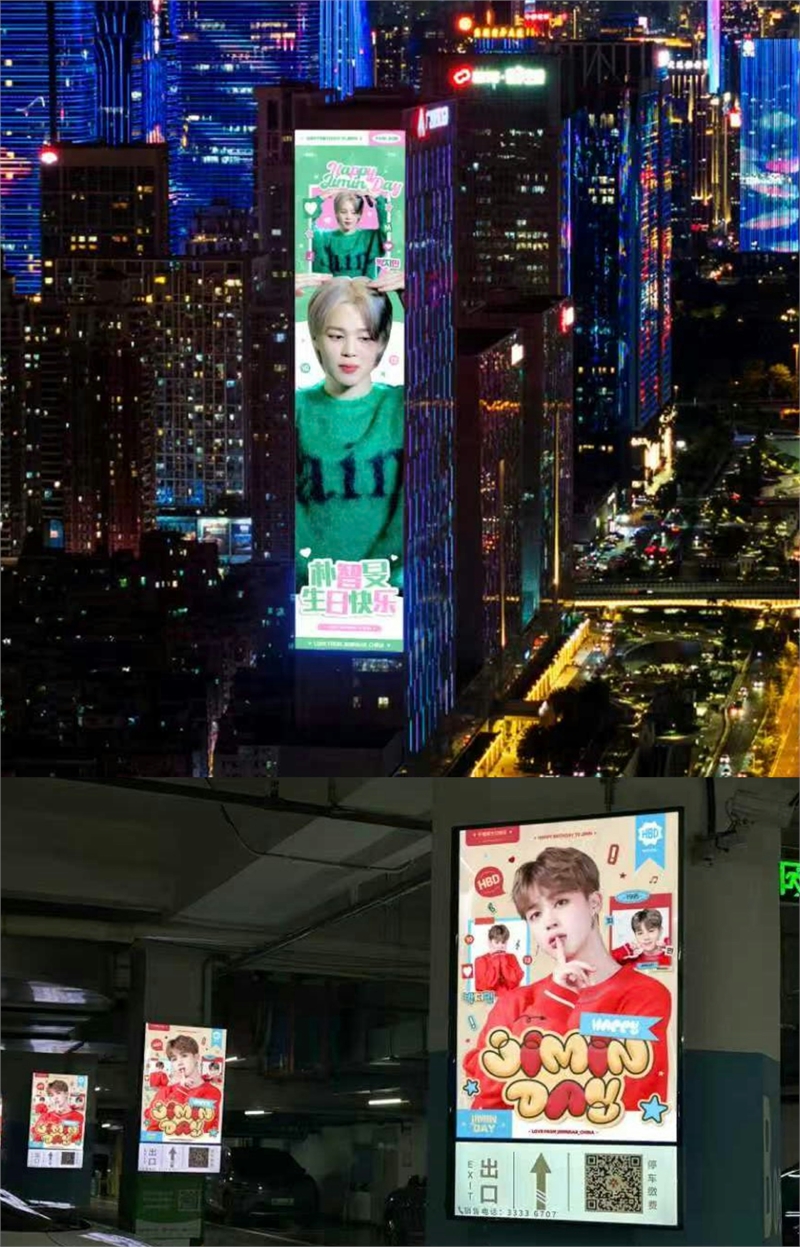 지민의 중국 팬베이스 지민바차이나(JIMINBAR_CHINA)는 지민의 생일을 축하하는 영상광고 서포트를 선전(Shenzhen)에서 진행했다. 지민의 생일인 13일에 펼쳐진 이번 서포트는 선전의 9개 구(區) 중 하나로 푸틴성(Futian) 중심부에 위치한 랜드마크인 IFC에서 진행됐다. 오후 9시 45분부터 10시까지 118M의 거대 스크린을 통해 지민의 30번째 생일을 축하 영상이 송출되며 선전의 밤거리를 화려하게 빛냈다.