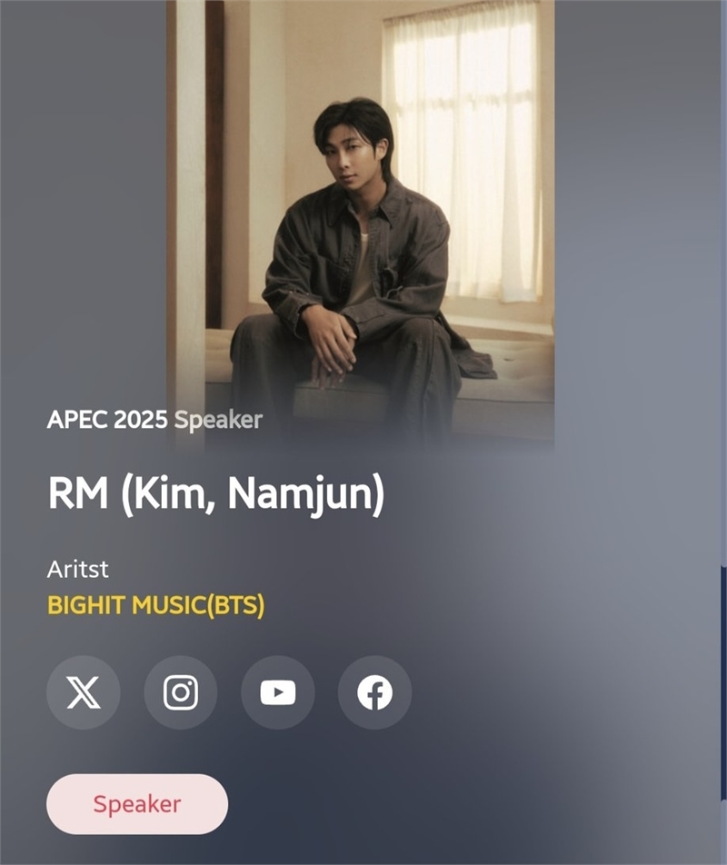 APEC 홈페이지는 RM에 대해 "창의적인 에너지를 가진 예술 애호가인 RM은 여러 예술 형식에서 영감을 받아 깊이 있는 가사를 써내는 것으로 알려져 있다. 음악에 대한 유연하고 철학적인 접근 방식과 최첨단 협업을 통해 창작의 경계를 확장하는 능력이 있다"고 소개했다.