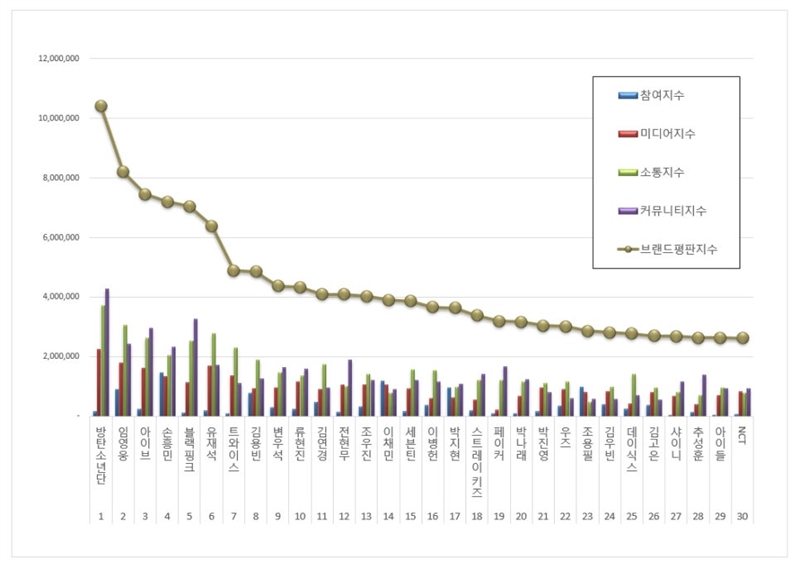 스타 브랜드평판 1위를 기록한 방탄소년단(RM, 진, 슈가, 제이홉, 지민, 뷔, 정국) 브랜드는 참여지수 16만 7277, 미디어지수 225만 9298, 소통지수 372만 5463, 커뮤니티지수 426만 9167이 되면서 브랜드평판지수 1042만 1205로 분석됐다. 지난 9월 브랜드평판지수 937만 434와 비교해보면 11.21% 상승했다.
