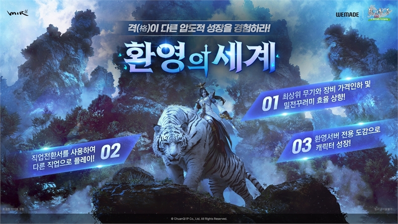 이용자는 기본 무공을 습득한 45레벨 캐릭터를 생성할 수 있으며, 성장에 필요한 직업별 기본 장비도 제공받는다. 서버 내 전용 상점에서는 '보옥', '축복의 기름', 고레벨 장비 등 핵심 아이템을 구입할 수 있고 기본으로 지급되는 '환영장보도'를 사용해 직업별 인기 무공 습득도 가능하다. 이밖에 '환영' 서버 전용 도감 시스템도 추가돼 성장 요소가 강화됐다.