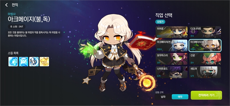 직업 구성도 마찬가지다. '메이플 키우기'에는 초창기 '메이플스토리'와 같은 '모험가' 직업군만 등장한다. 각각 전사, 마법사, 궁수, 도적으로, 각 직업은 고유 스킬을 통해 사냥을 하고 일정 레벨을 달성 시 전직을 통해 새로운 스킬을 습득할 수 있다.