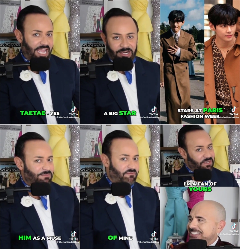 최근 미국 패션 디자이너 닉 베레오스(Nick Verreos)는 파리 패션 위크에서 뷔를 보고 팬이 됐다고 고백했다. 뷔를 ‘태태’와 ‘태형’으로 부르면서 자신의 새로운 뮤즈라고 팬심을 드러냈다. 닉 베레오스는 미국 패션 리얼리티 프로그램 ‘프로젝트 런웨이’ 시즌 2에 참가해 명성을 얻은 세계적인 디자이너다.