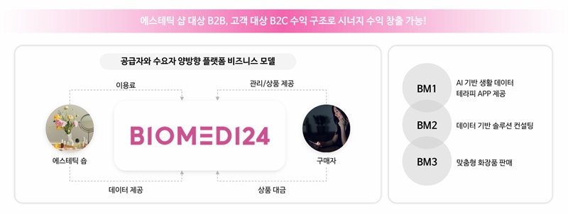 에스테틱 샵 입장에서 '바이오메디'는, 고객 만족도 제고를 넘어 실질적인 수익 증가로 이어진다. AI피부진단으로 수집된 고객 데이터를 기반으로 맞춤형 화장품을 추천하고 판매함으로써, 기존 화장품 사업과의 시너지를 창출하고 추가 수익을 얻을 수 있다. 또한, 고객 관리, 예약, 매출 관리 등 샵 운영 전반을 전산화하는 통합 관리 시스템을 통해 운영 효율성을 20% 이상 개선할 수 있다는 강점도 있다.