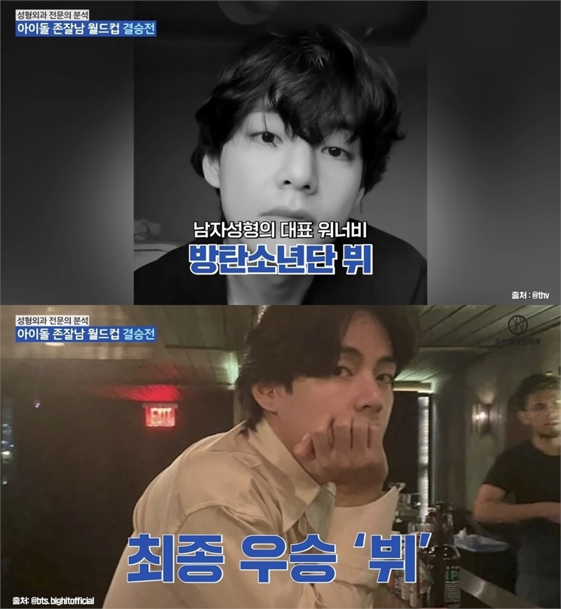 최근 성형외과 전문의 이경묵은 유튜브 채널에 “BTS, 라이즈, 차은우 다 모였다”라는 제목으로 K팝 비주얼을 대표하는 32명의 아이돌을 대상으로 이상형 월드컵을 진행했다. 전문의는 뷔를 최종 우승자로 선정하며 “뷔는 남자들이 봤을 때도 멋있다. 남자들이 성형상담을 왔을 때 가장 많이 들고 오는 사진은 압도적으로 뷔가 많다”라며 남자들이 가장 닮고 싶어 하는 워너비 스타라고 밝혔다.