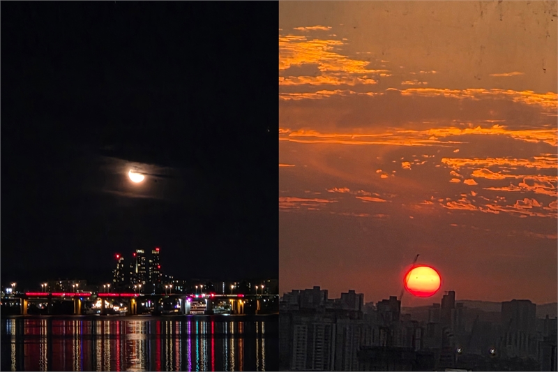 이어 지민은 11일 저녁에 다시 한 번 붉게 물든 일몰 사진을 공개하며 “오늘은 해가 떨어지는 중이네요”라는 글을 남겼다. 지평선 아래로 천천히 내려앉는 해와 붉은 구름이 어우러진 풍경은 마치 전날의 달빛 사진과 한 편의 연작 시처럼 이어지며 팬들에게 또 다른 감동을 선사했다.
