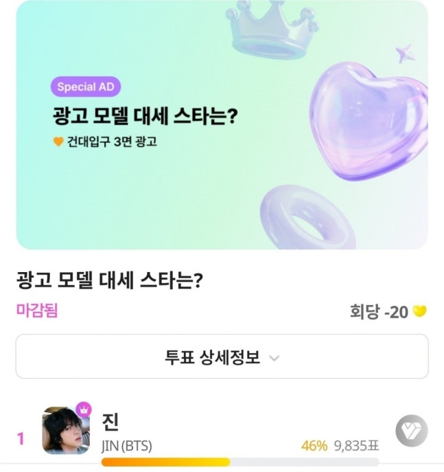 최근 진은 마이원픽(MY1PICK)이 진행한 '광고 모델 대세 스타' 투표에서 46%의 압도적 득표율로 1위를 차지하며 글로벌 광고킹의 위상을 재확인했다. 앞서 포브스 코리아(Forbes Korea)가 아이돌챔프와 함께 실시한 '포브스 선정, 구매 욕구 높이는 CF천재 아이돌' 투표에서도 43.83%를 획득하며 우승했다.