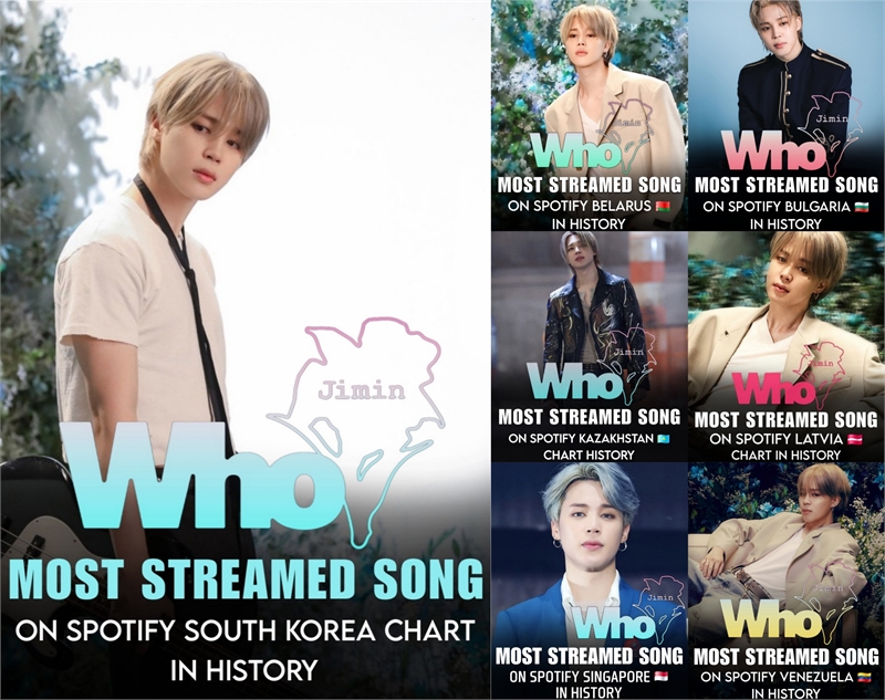 지민의 정규 2집 타이틀곡 'Who'(후)는 스포티파이 국가별 차트 중 한국과 더불어 불가리아, 벨라루스, 카자흐스탄, 베네수엘라, 싱가포르, 라트비아까지 총 7개국에서 역대 최다 스트리밍 곡(Most Streamed Song)으로 기록됐다. 이는 K팝 가수 중 최초이자 유일한 성과다.
