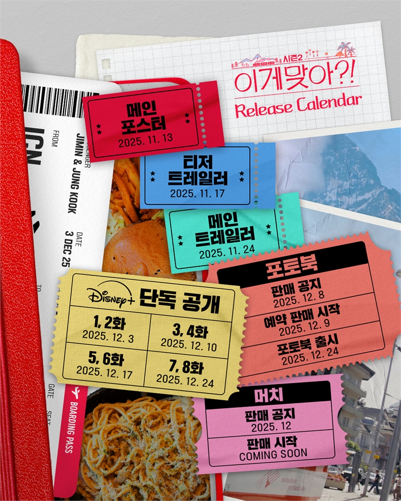 ‘이게 맞아?!’는 지민과 정국의 우정 여행기를 담은 디즈니+ 오리지널 시리즈다. 시즌2는 전역 일주일 만에 시작된 리얼한 여행기를 다룬다. 이들은 12일간 오래된 여행책 하나만 들고 스위스와 베트남 다낭 곳곳을 누빈다. ‘이게 맞아?!’ 시즌2는 총 8개의 에피소드로 구성됐다. 오는 12월 3일부터 24일까지 매주 수요일 두 편씩 만날 수 있다.