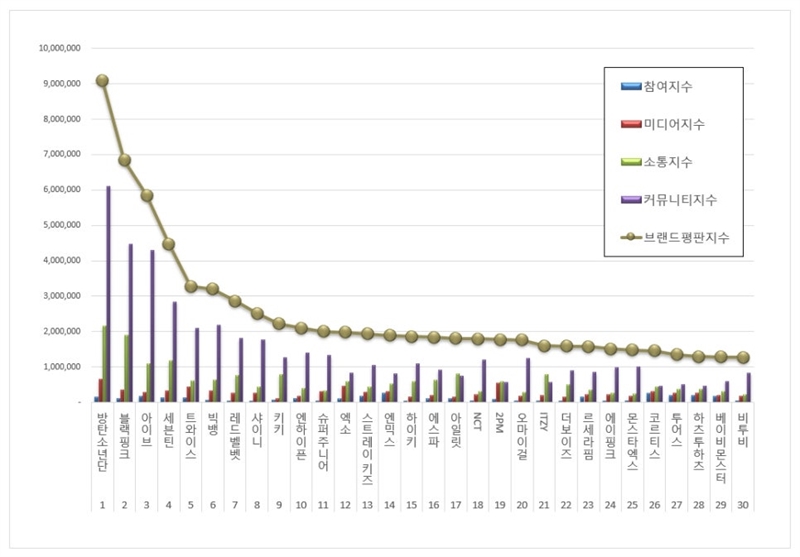 아이돌그룹 브랜드평판 1위를 기록한 방탄소년단(RM, 진, 슈가, 제이홉, 지민, 뷔, 정국) 브랜드는 참여지수 16만 1896, 미디어지수 65만 1172, 소통지수 216만 2991, 커뮤니티지수 610만 6959가 되면서 브랜드평판지수 908만 3018로 분석됐다. 지난 10월 브랜드평판지수 비교해보면 17.37% 상승했다.