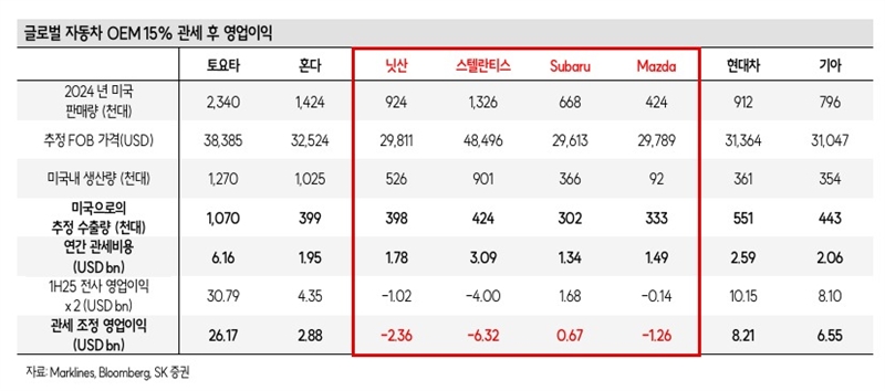 이와관련, 이날 보고서에선 '동일한 15% 관세 운동장'을 점유율 상승의 키로 봤다. 윤 애널리스트는 "25% 관세하에서도 미국 점유율이 상승했으며, 이익 체력이 약한 닛산, 스텔란티