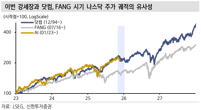 과거 기술혁신 강세장의 경험을 고려해 내년 초 상승 전환할 것이라 예상했다. 노 애널리스트는 "이번 AI 강세장은 기술혁신 사이클 출현에 기술주 주도로 시장이 상승했다는 특성과 주가 궤적이 대부분 일치한다는 점에서 닷컴, FANG(페이스북·애플·넷플릭스·구글) 강세장과 유사하다"며 "과거 패턴을 참고할 경우 주가 조정이 마무리되고 상승 추세로 전환되는 시점은 내년 초"라고 분석했다.