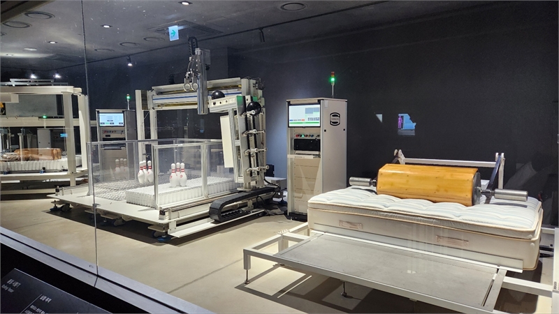 시몬스의 수면 연구·개발(R&D) 센터 ‘팩토리움’ 내부에서 매트리스 내구성 테스트가 진행되고 있다. (사진=내미림 기자)