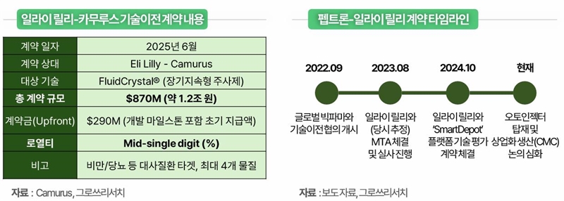 한편, 일라이 릴리는 지난 6월 스웨덴 카무루스와도 기술이전 계약을 체결한 바 있다. 당시 총계약금은 약 8억7,000만 달러로, 펩트론의 계약 역시 최소 그 수준 이상의 잠재력이 있다는 기대가 나온다. 특히 카무루스의 제형이 초기 약물 농도 피크, 유기용매 사용, 굵은 주사바늘 등에서 구조적 한계를 드러낸 반면, 펩트론의 SmartDepot은 안정성과 편의성 모두에서 앞선 기술로 평가받는다.