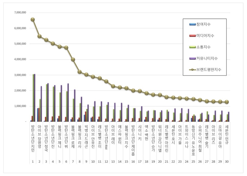 아이돌 개인 브랜드평판 1위를 기록한 방탄소년단 지민 브랜드는 참여지수 8만 8116, 미디어지수 36만 5672, 소통지수 305만 85, 커뮤니티지수 306만 2877이 되면서 브랜드평판지수 656만 6749로 분석됐다.