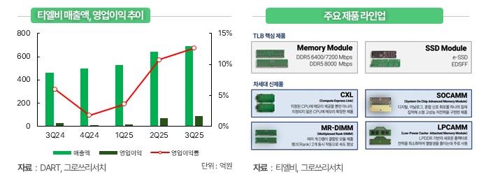 대표적인 수혜 기업은 티엘비다. 메모리용 고부가 PCB 제조사인 티엘비는 LPDDR5X 기반의 차세대 모듈 생산에 핵심 기술을 보유하고 있다. 고다층 설계와 HDI 공법을 통해 경쟁사 진입을 차단하고 있으며, LPCAMM 모듈 수요 확대에 따른 신규 매출원 확보가 기대된다.