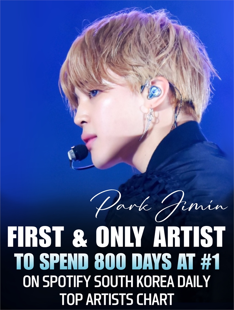 세계 최대 음원 플랫폼 스포티파이 차트 업데이트에 따르면, 지민은 스포티파이 '한국 데일리 톱 아티스트' 차트에서 800일째 정상에 올랐다. 해당 차트 역사상 최초이자 유일한 누적 800회 1위 신기록이다.