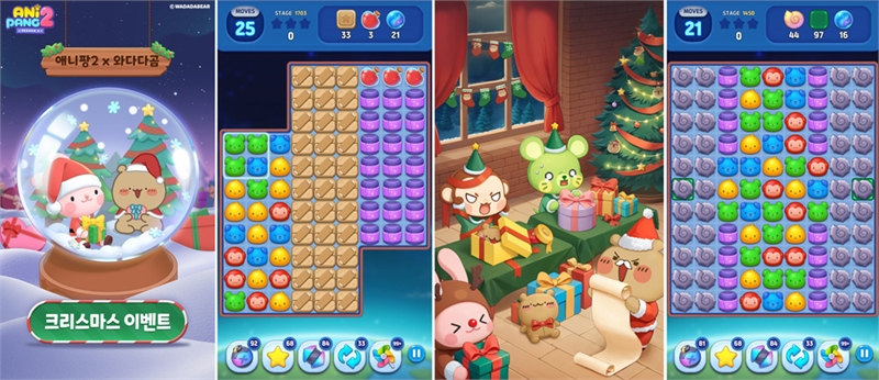 위메이드플레이는 모바일 퍼즐 게임 '애니팡2'에 인기 캐릭터 '와다다곰'이 등장하는 크리스마스 이벤트를 진행한다고 3일 밝혔다.