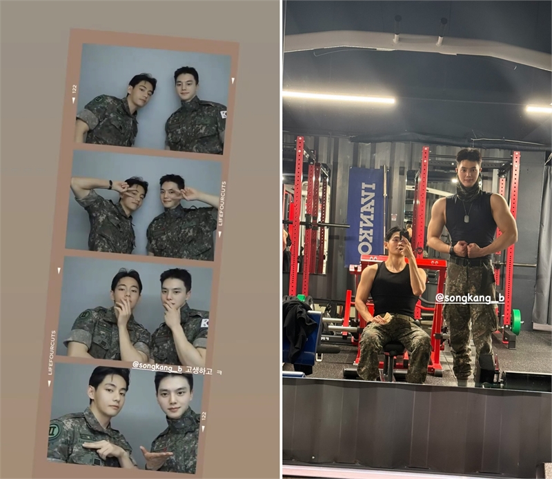 뷔는 지난 6월 9일 전역을 하루 앞두고 근황을 전한 바 있다. 이날 뷔는 송강과 함께 헬스장에서 운동을 하는 모습과 군복을 입고 네컷 사진을 찍는 영상도 게재했다. 네컷 사진에는 “고생하고”라며 짧은 문구로 우정을 전했다. 군 복무 중 친해진 두 사람이 운동을 같이 하거나 일상을 함께 하는 모습을 본 팬들은 이들의 우정에 응원을 보내고 있다.