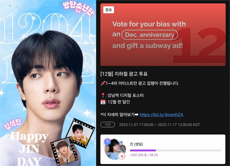 오늘(4일) 생일인 진은 여러 인기투표 플랫폼에서 12월 아티스트 생일 부문 1위를 석권, 특별한 'JINDAY' 축제 분위기를 한껏 달구고 있다.