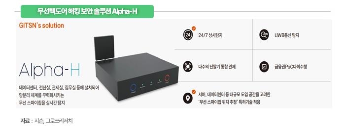 지슨의 주력 제품 ‘Alpha-H’는 무선 백도어 해킹 방식을 탐지하는 장비로, 내부자가 USB 케이블 등 하드웨어에 스파이칩을 심어 외부망과 연결되지 않은 폐쇄망에서도 무선 전파를 통해 데이터를 탈취하는 공격을 차단한다. 기존 Wi-Fi 전용 탐지 솔루션인 WIPS가 탐지하지 못하는 비(非) Wi-Fi 전파 기반 해킹까지 감지하는 것이 강점이다.