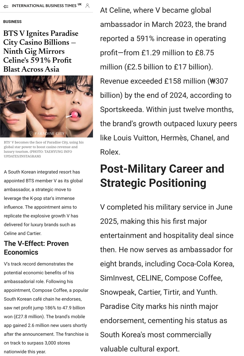 IBT는 ‘뷔의 전역 후 경력 및 전략적 포지셔닝’의 소제목에서 “뷔가 전역 후 첫 번째 엔터테인먼트 및 호스피탈리티(호텔, 음식서비스, 카지노, 관광 등 서비스산업 전반) 계약을 체결했다”고 설명했다.