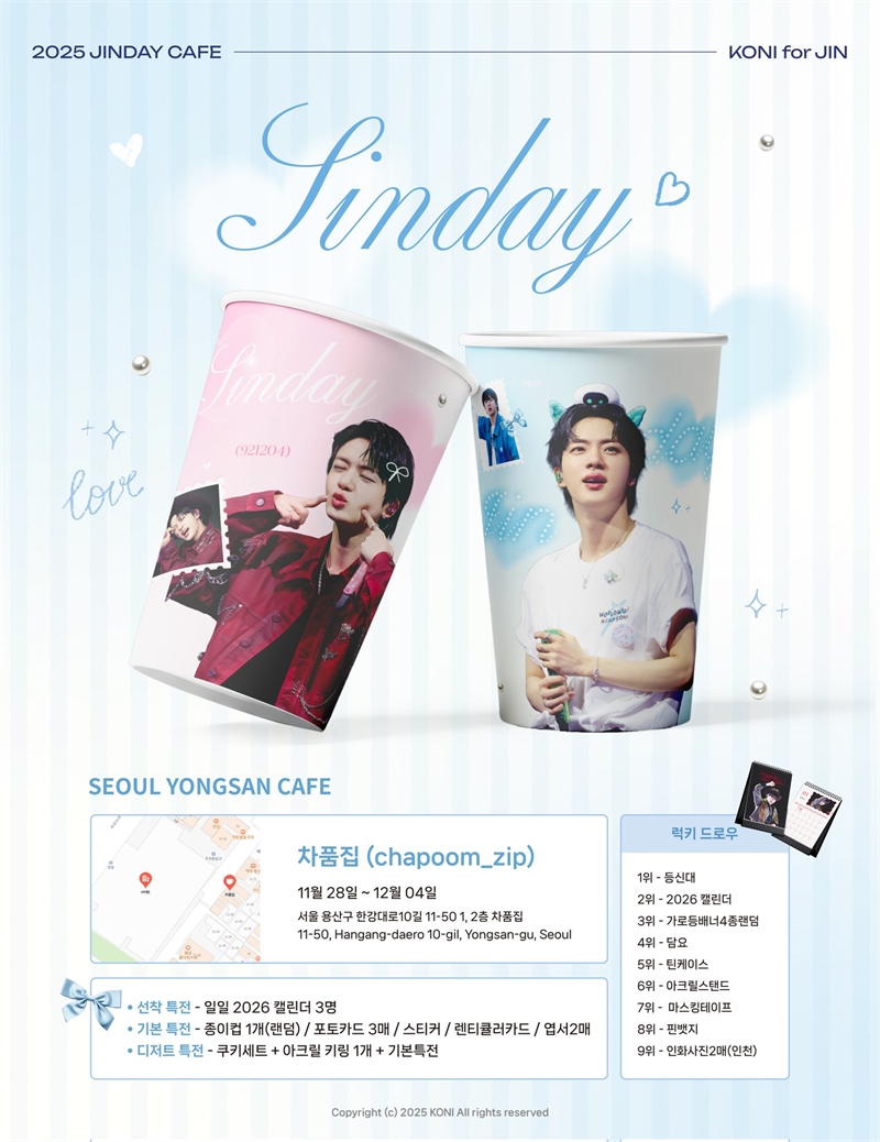 또 다른 팬 계정 KONI(@JpKoni)는 11월 28일부터 12월 4일까지 서울 용산 차품집에서 'Happily Ever After'를 테마로 생일 카페 이벤트를 열고, 음료 구매 시 컵 2종을 제공했다. 또한 11월 22일부터 12월 4일까지, 진으로 래핑한 버스를 운행하며 분위기를 띄었다.