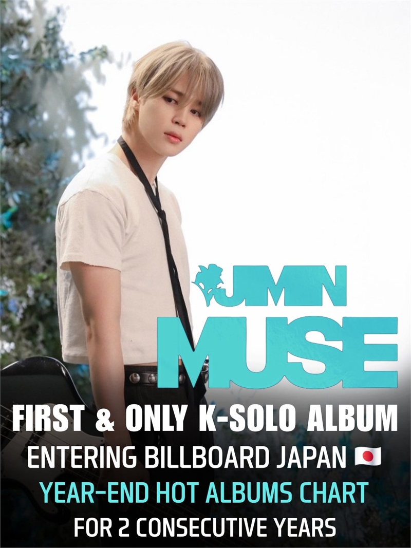 최근 빌보드 재팬이 발표한 2025년 연간 차트에 따르면, 지민의 솔로 2집 ‘MUSE’ 타이틀곡 ‘Who’가 종합 싱글 차트 '빌보드 재팬 핫 100’에서 73위에 올랐다. 지민은 올해 해당 차트에 이름을 올린 유일한 한국 남성 가수로 기록됐다. ‘Who’는 빌보드 재팬 ‘스트리밍 송’ 연간 차트 61위에도 랭크되며 일년동안 받은 사랑을 입증했다.