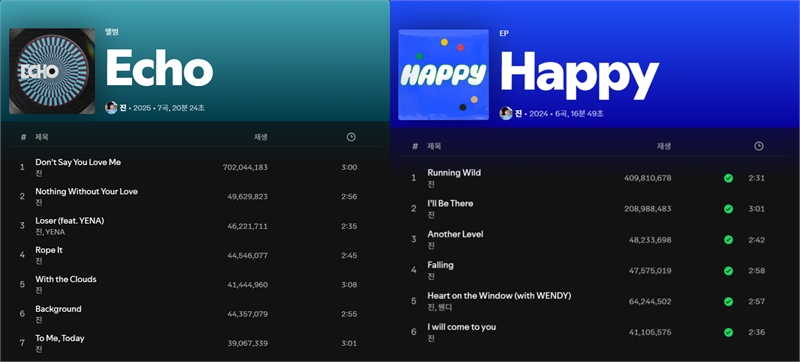 진의 두 번째 솔로 앨범 'Echo(에코)'가 스포티파이에서 9억 6000만 스트리밍을 돌파한 데 이어 첫 번째 솔로 앨범 'HAPPY(해피)' 역시 8억 스트리밍을 넘어서며 솔로 아티스트로서 독보적인 존재감을 과시했다.