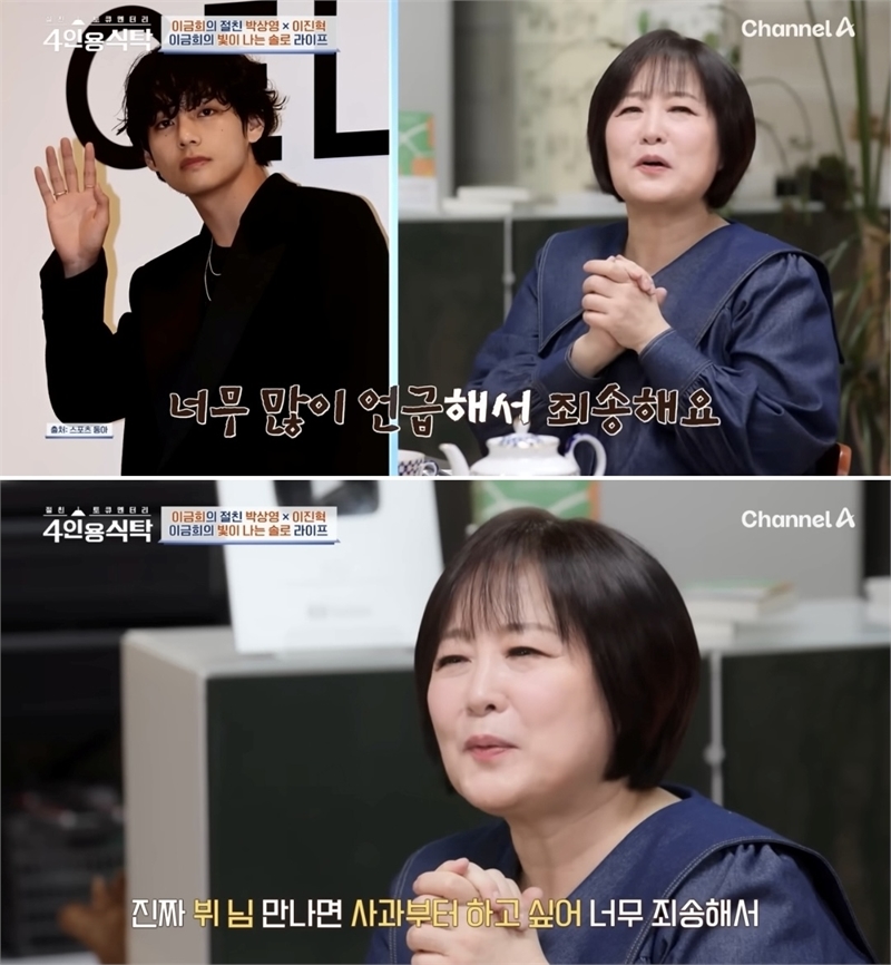 지난 8일 방송된 채널A ‘절친 토큐멘터리–4인용 식탁’에서도 ‘이상형’에 대해 질문을 받자 이금희는 “잘생긴 남자요. 뷔... 너무 죄송해요. 제가 너무 많이 언급해서 얼마나 불편하시겠어요”라면서 곧 민망한 듯 “만나면 사과 먼저 하고 싶다”고 고백했다. 이에 박경림이 “사과하려면 일단 만나야죠?”라고 받아쳤다. 이금희는 기다렸다는 듯이 “그러니까! 만나야 사과하지. 너무 죄송합니다”라며 수줍은 표정을 지었다.