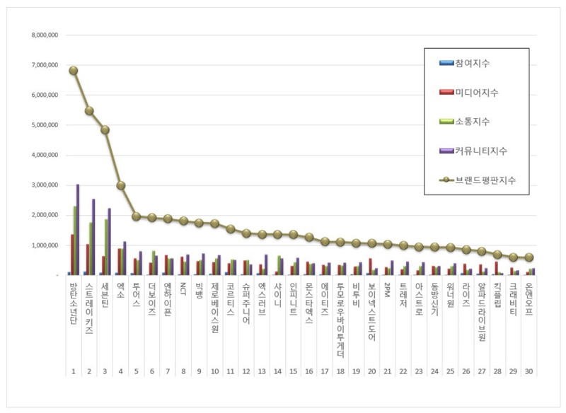 보이그룹 브랜드평판 1위를 기록한 방탄소년단(RM, 진, 슈가, 제이홉, 지민, 뷔, 정국) 브랜드는 참여지수 11만 491, 미디어지수 136만 3882, 소통지수 231만 5032, 커뮤니티지수 303만 7797이 되면서 브랜드평판지수 682만 7202로 분석됐다.