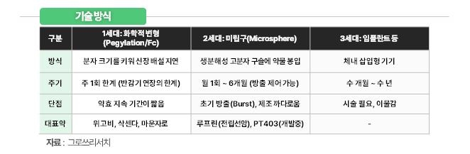 미립구는 약물을 생분해성 고분자(PLGA 등) 안에 봉입해 체내에서 서서히 방출되도록 설계하는 제형이다. 약물 체류 시간을 물리적으로 늘려 투여 간격을 ‘월 1회 이상’으로 확장할 수 있다는 점에서, 장기 체중 관리 시장의 ‘편의성 혁신’으로 평가받는다. 빅파마 입장에서도 제형 변경이 특허 만료 이후 시장 지배력을 연장하는 수명연장전략(LCM)의 핵심 카드가 될 수 있다고 진단했다.