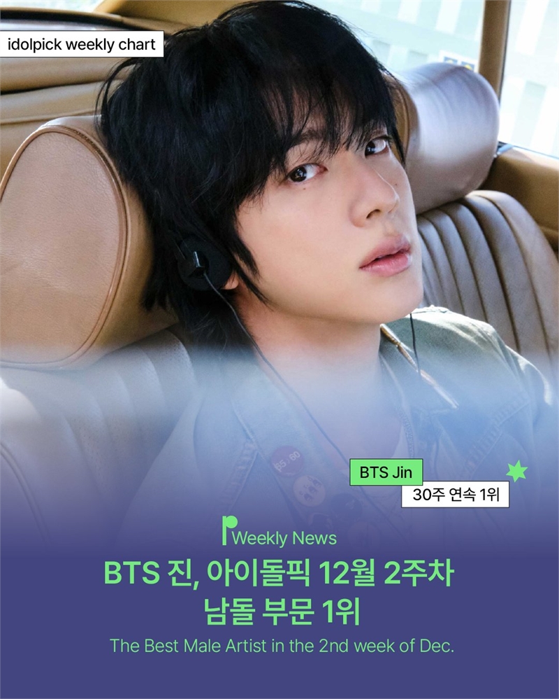 진은 12월 2주차 아이돌픽 위클리 투표에서 6만 2638픽을 얻어 남자 아이돌 개인 부문 1위에 올랐다. 해당 주차 전체 최다 득표를 기록하며 30주 연속 1위라는 기록도 함께 세웠다.