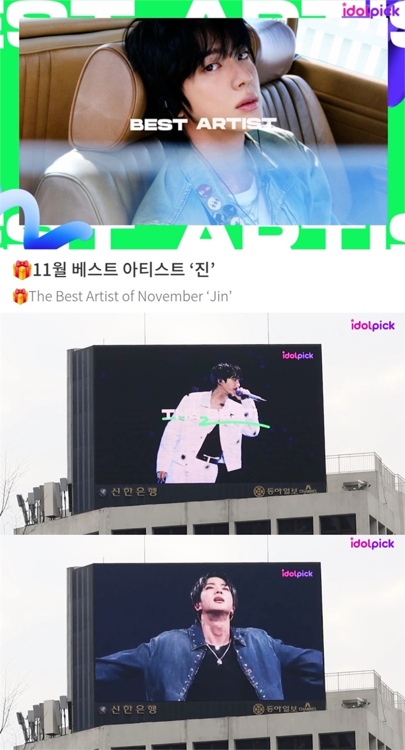 아이돌픽은 2주간의 위클리 투표 결과를 합산해 최다 득표 상위 5명(또는 팀)을 대상으로 초대형 전광판 서포트를 진행한다. 진은 11월 4주차와 12월 1주차 득표수를 합산해 총 12만 9192픽을 기록, 168회차 전광판 서포트 최다 득표자로 선정됐다. 해당 광고는 12월 18일부터 20일까지 3일간 서울 중구 롯데에비뉴엘 맞은편 초대형 전광판을 통해 공개된다.