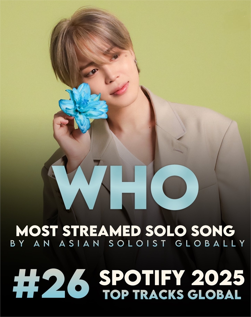 세계 최대 음원 스트리밍 플랫폼 스포티파이가 발표한 '2025 랩드(Wrapped) 연말 결산' 캠페인에 따르면, 지민의 2집 'MUSE'(뮤즈) 타이틀곡 'Who'(후)가 [Top Tracks of 2025 Global] 리스트 26번째에 이름을 올렸다.